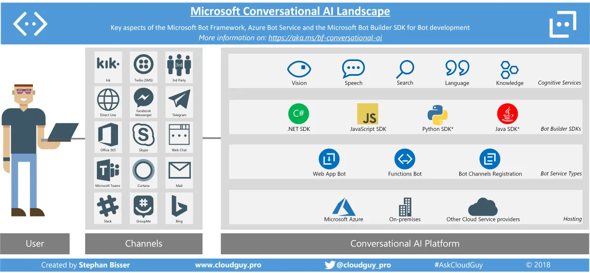 Almost a year ago I published one of my first infographics which should visualize the various components of the Microsoft Bot Framework. Back then, the Bot Framework was available in version 3.0 and as you can imagine, since then there have been a lot of updates and changes. Some weeks ago, Microsoft announced that version 4.0 is now GA with many improvements and enhancements. Therefore, I decided to update my version of the infographic in order to visualize what changed and what’s important when talking about the Bot Framework, which I also renamed the “Microsoft Conversational AI Landscape”: